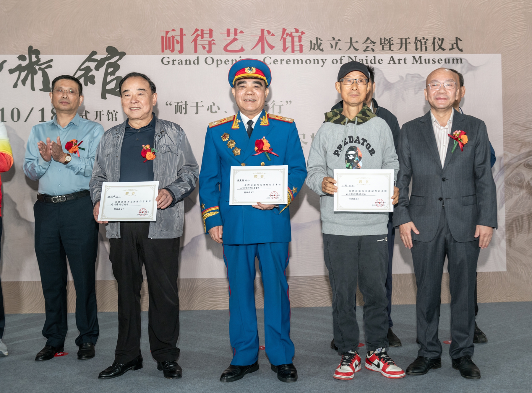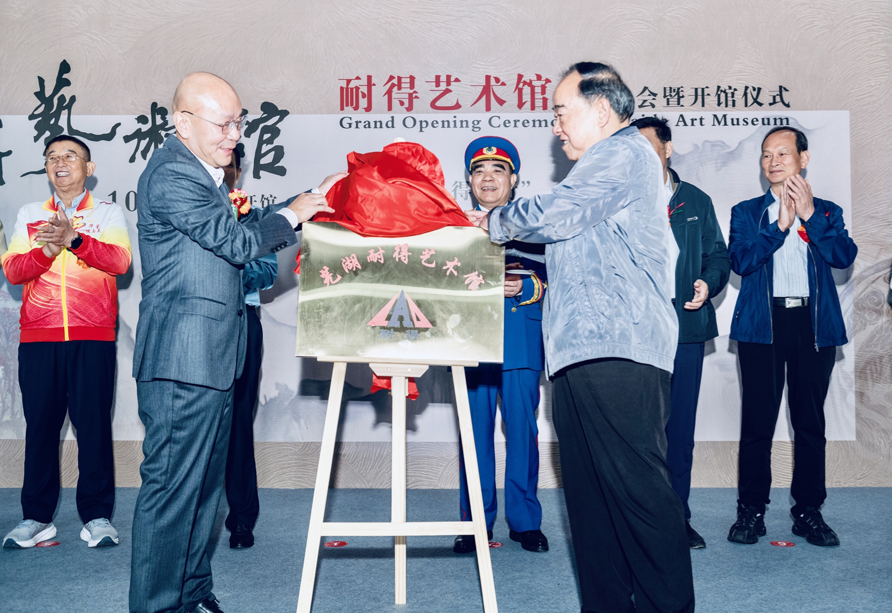 為了更好的將蕪湖耐得藝術(shù)館品牌推廣,研究決定聘請(qǐng)魏道斌為耐得藝術(shù)館藝術(shù)顧問(wèn),聘請(qǐng)?zhí)召t鋒、王彪為名譽(yù)館長(zhǎng)。10點(diǎn)58分魏道斌和王文軍共同為蕪湖耐得藝術(shù)館揭牌。